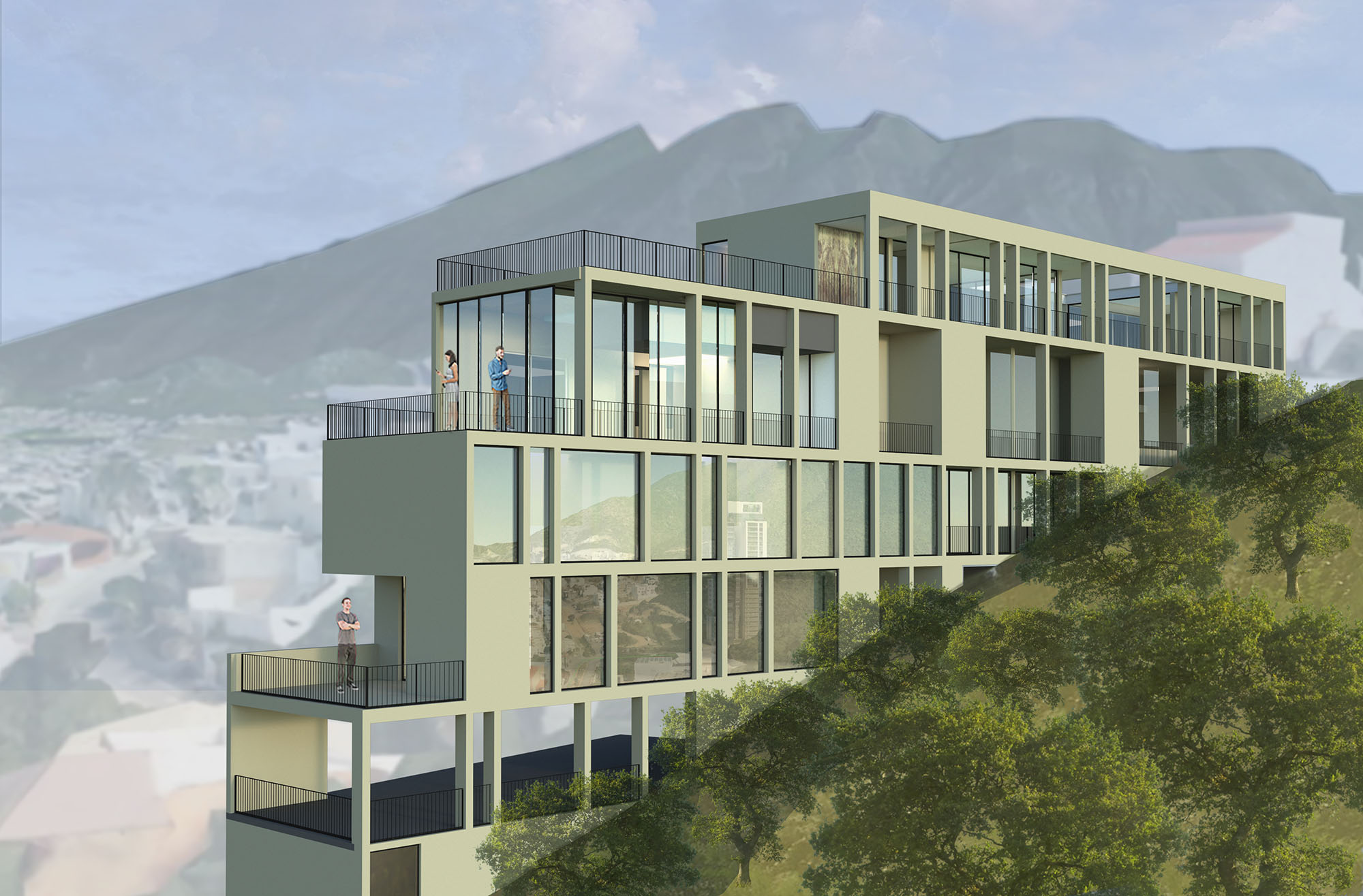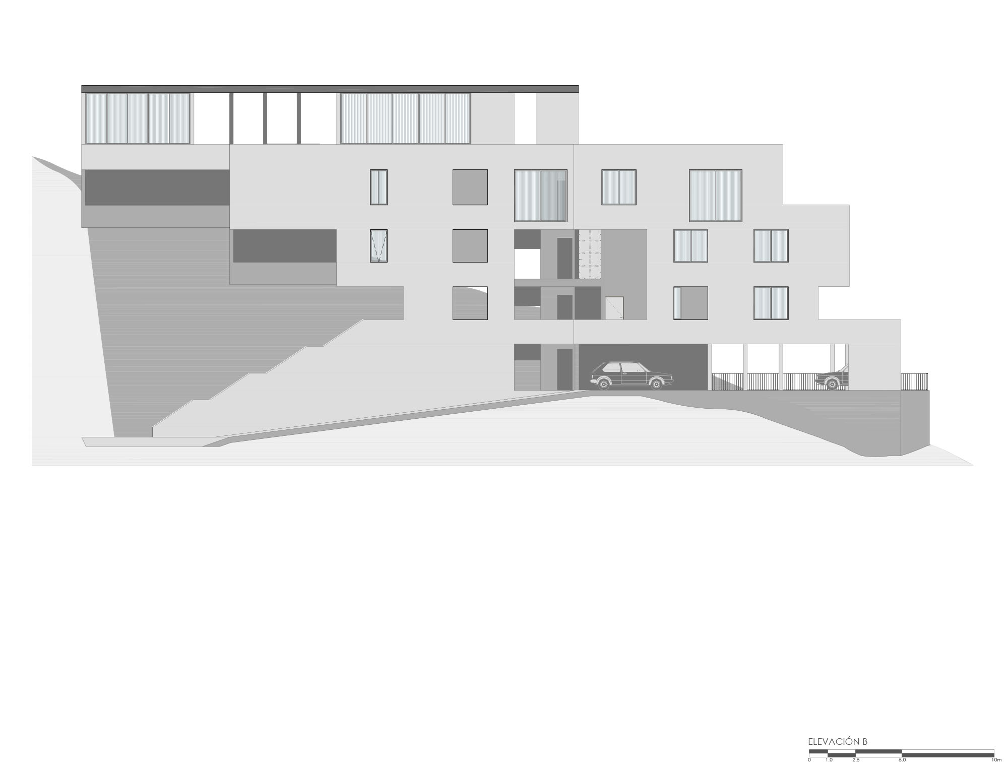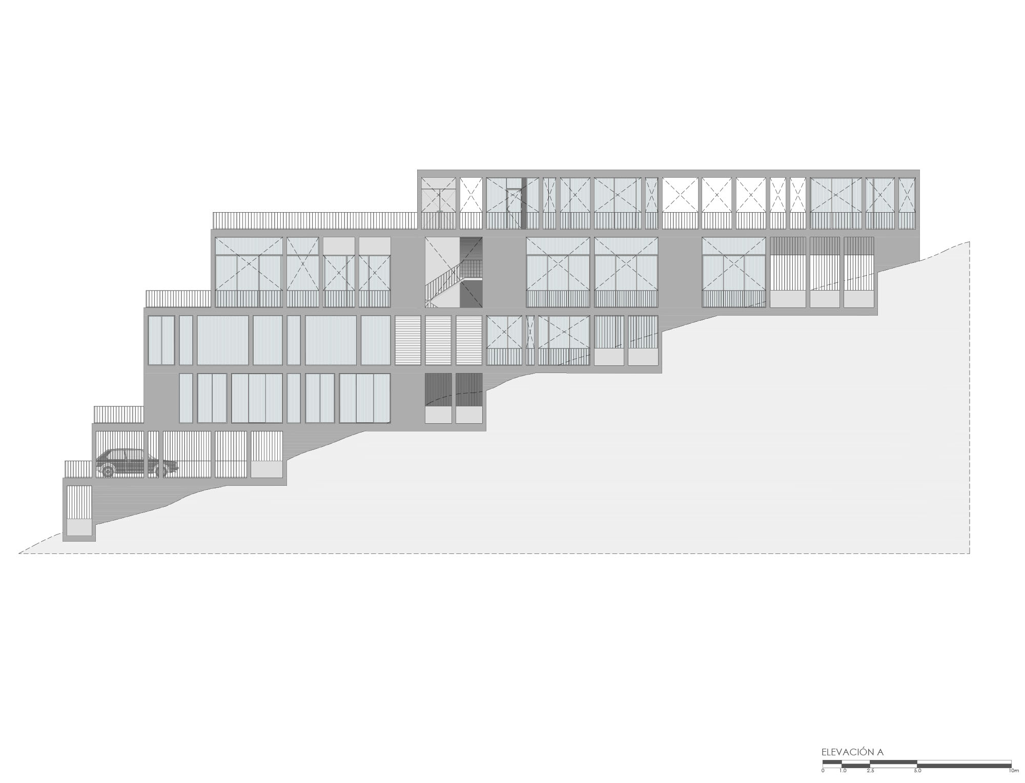 El gran volumen busca la misma altura de las propiedades vecinas, pero aprovechando la longitud del terreno consiguiendo una imagen que "completa" la montaña con un nuevo volumen construido.