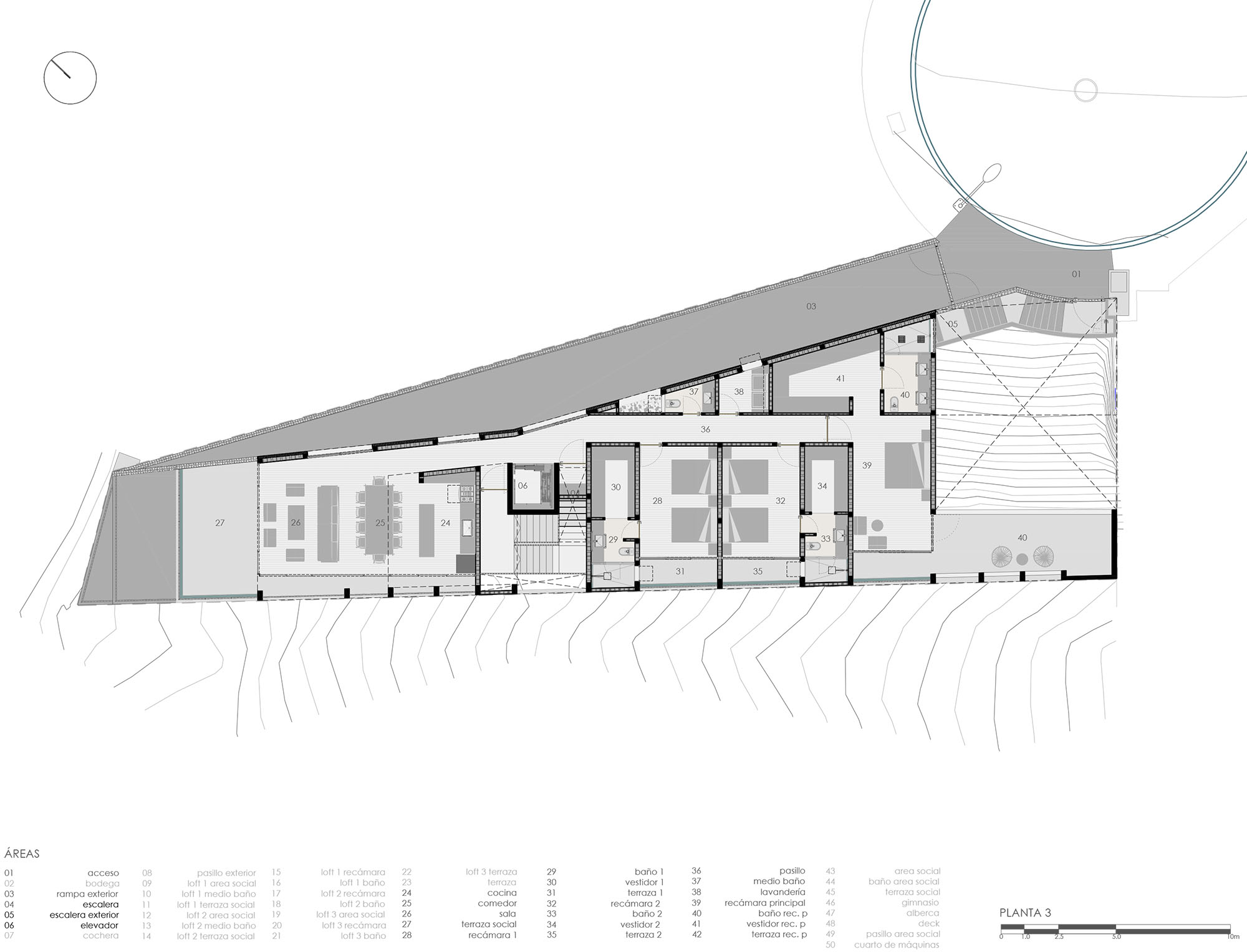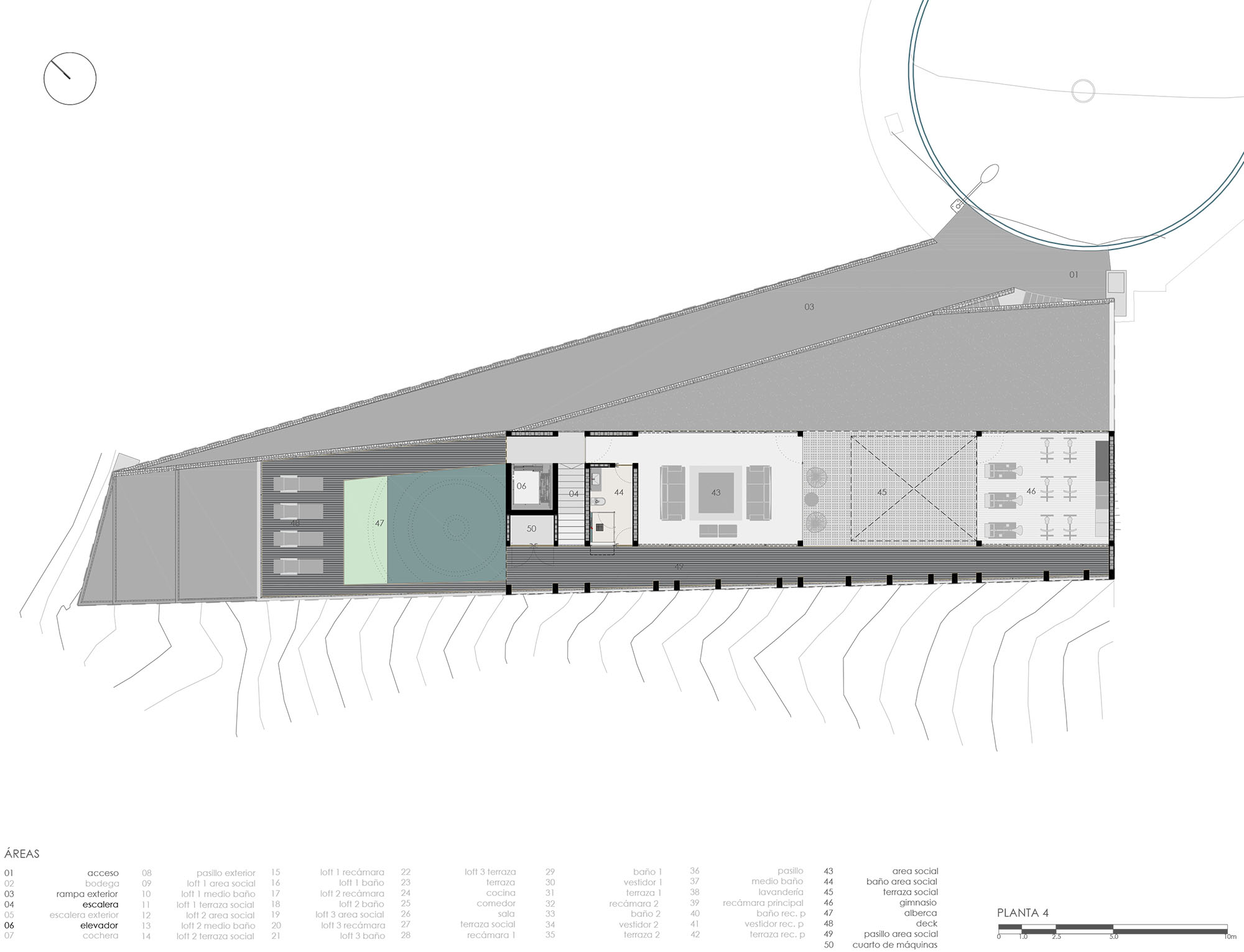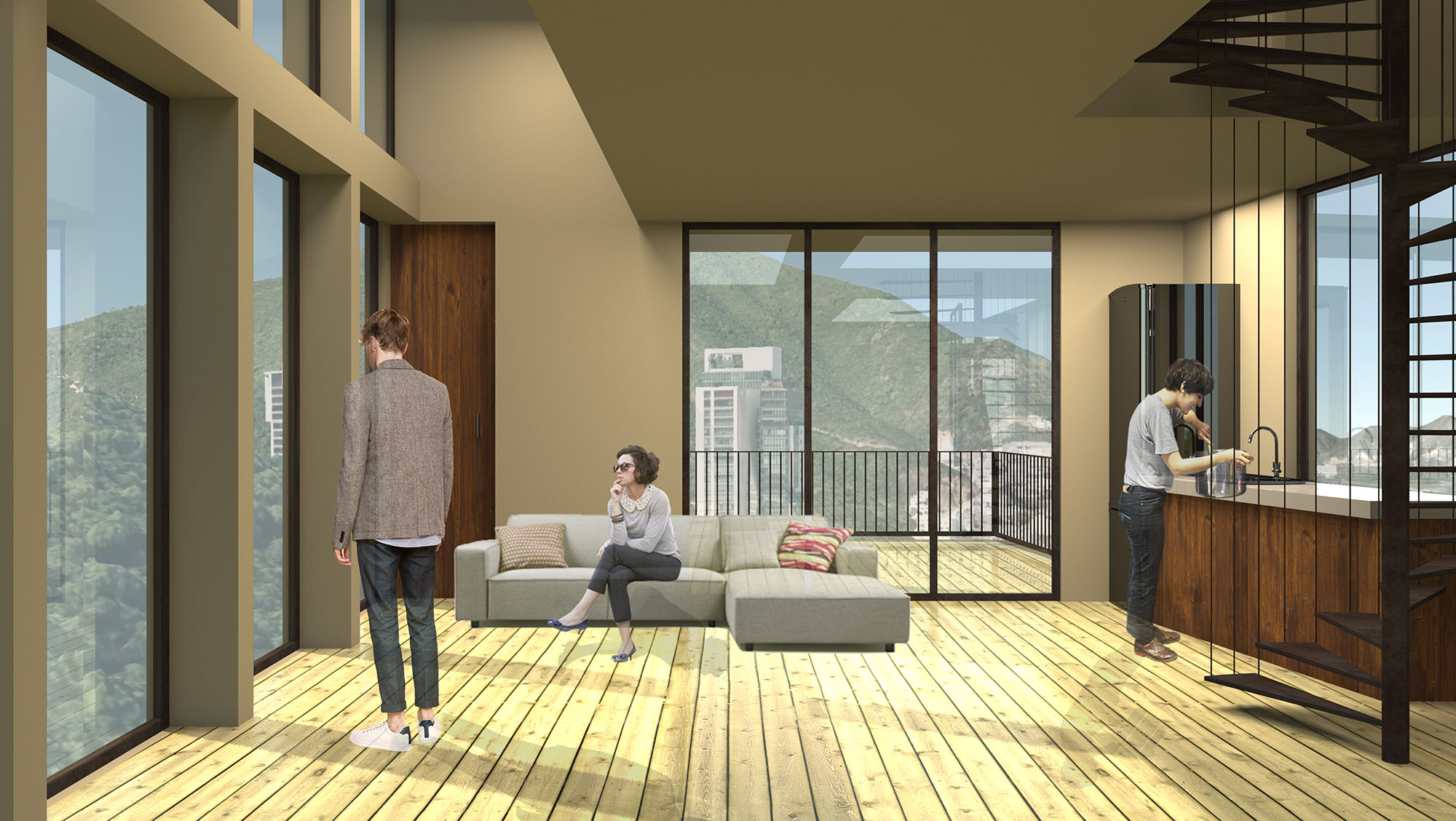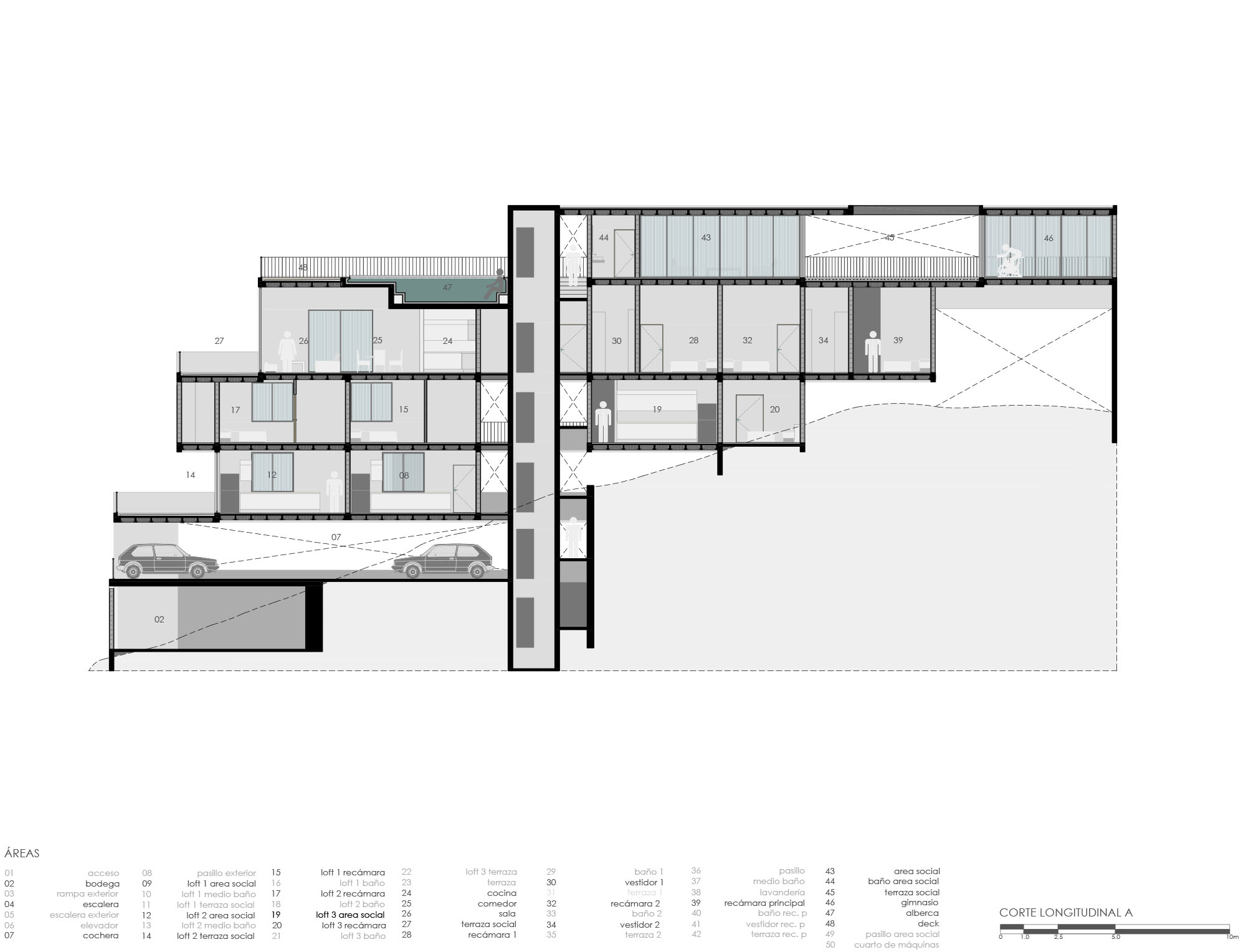 Las áreas de los hermanos menores, a doble altura, en plantas primera y segunda cuentan con su propia área social a modo de pequeños "lofts". El abuelo vive en un pequeño "departamento" en la segunda planta. El dueño del complejo, su esposa y sus pequeños hijos habitan la gran planta tercera mientras que el jardín, la alberca y otra serie de áreas comunes se ubican en una cuarta planta.