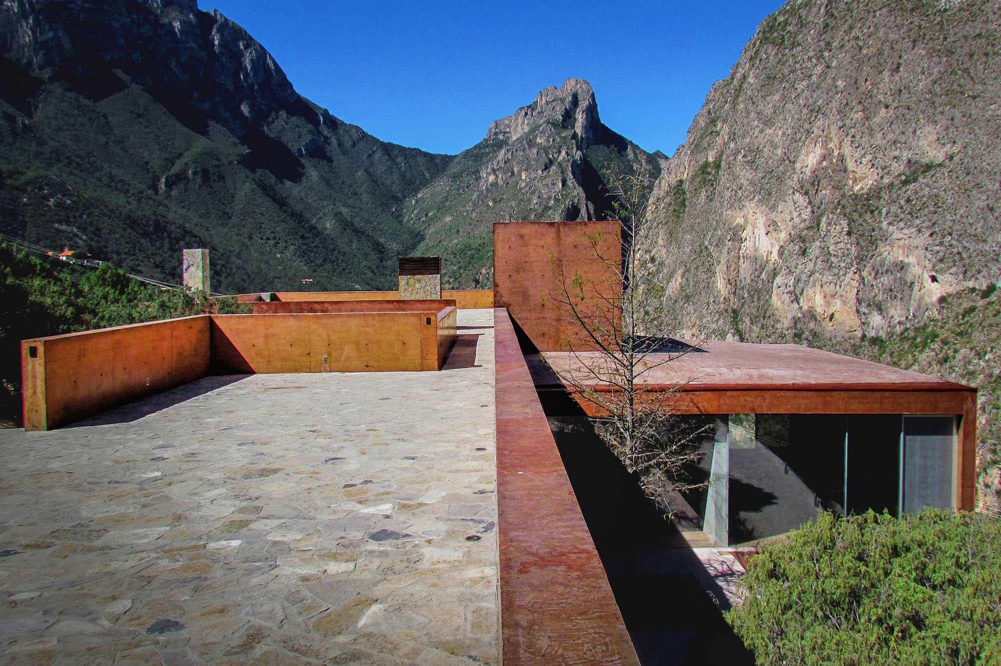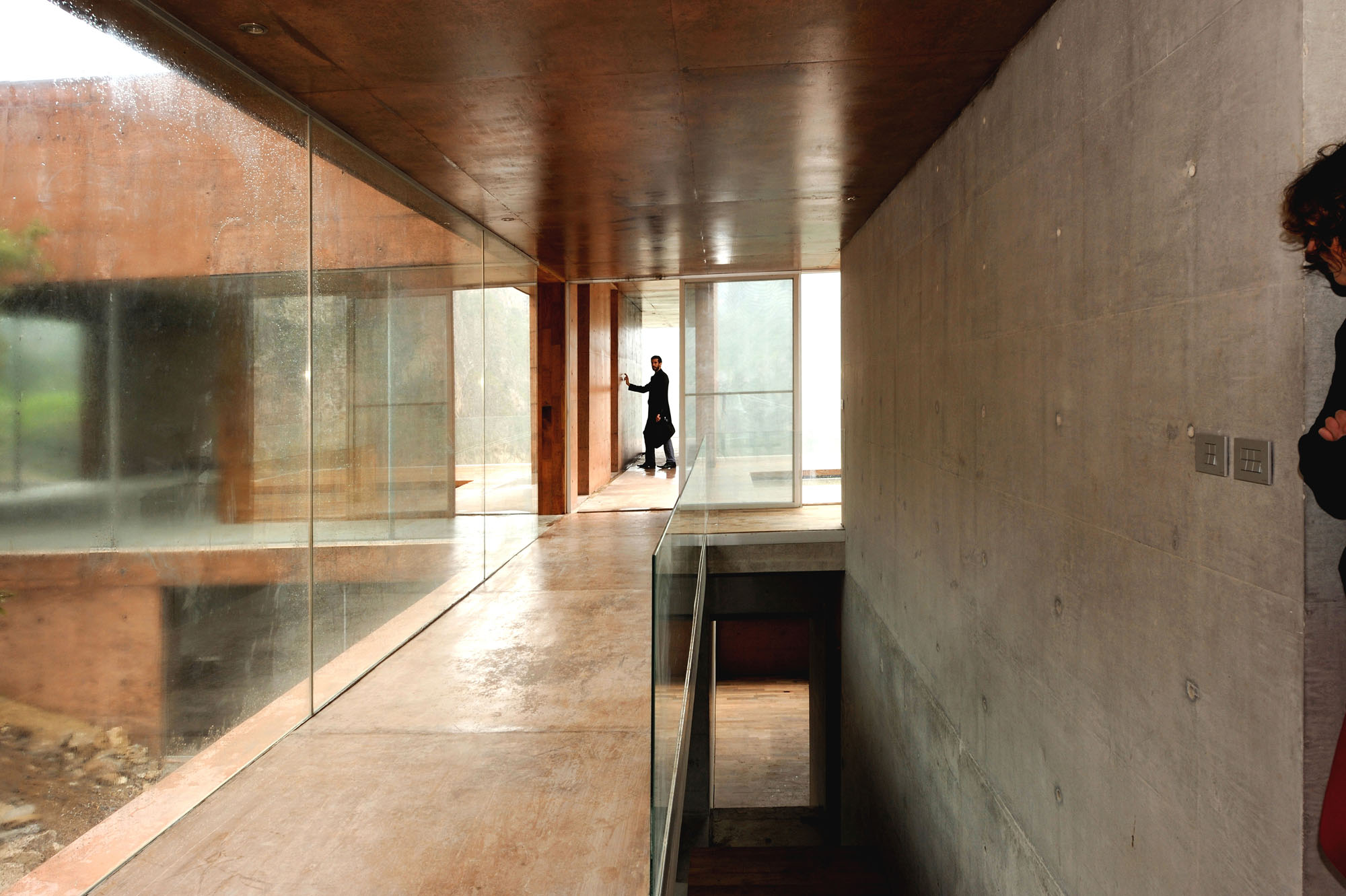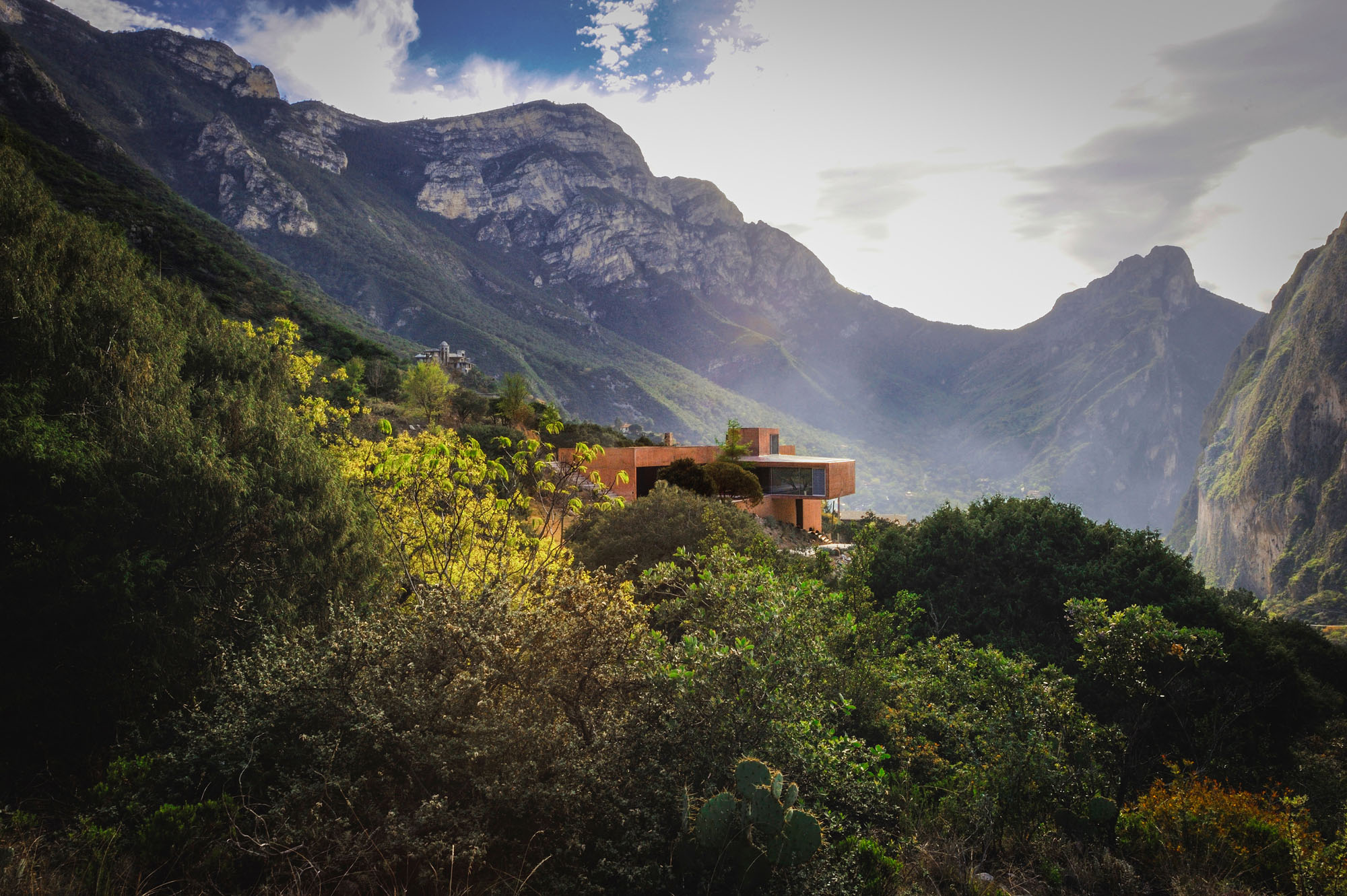 Para reducir el impacto del edificio en el entorno, los muros y losas exteriores se ejecutan en concreto de color ocre rojizo que a lo lejos pierde la casa entre las montañas y de cerca dialoga con los tonos y texturas del paisaje.