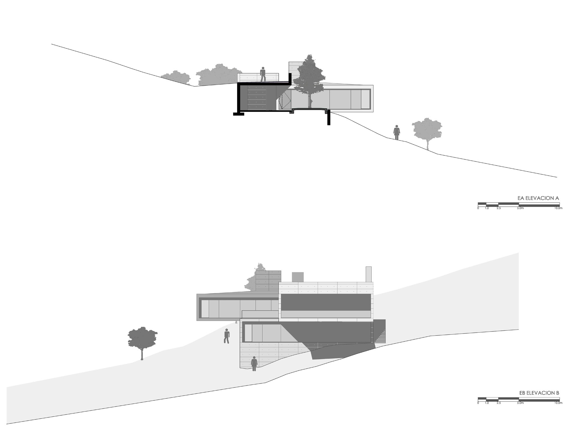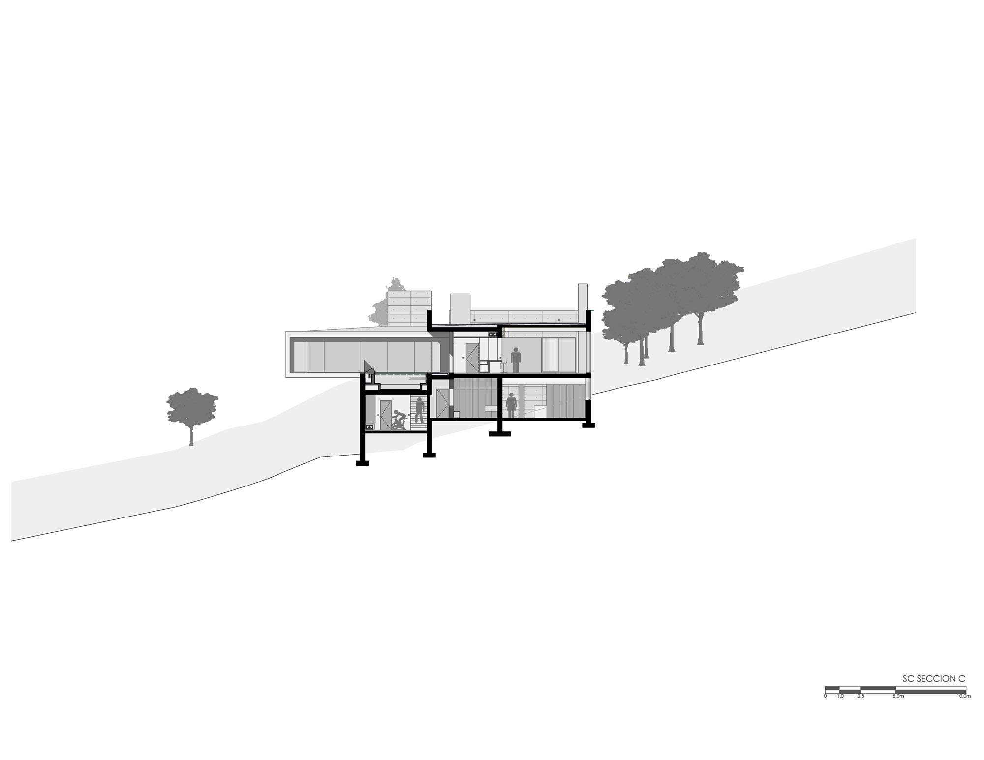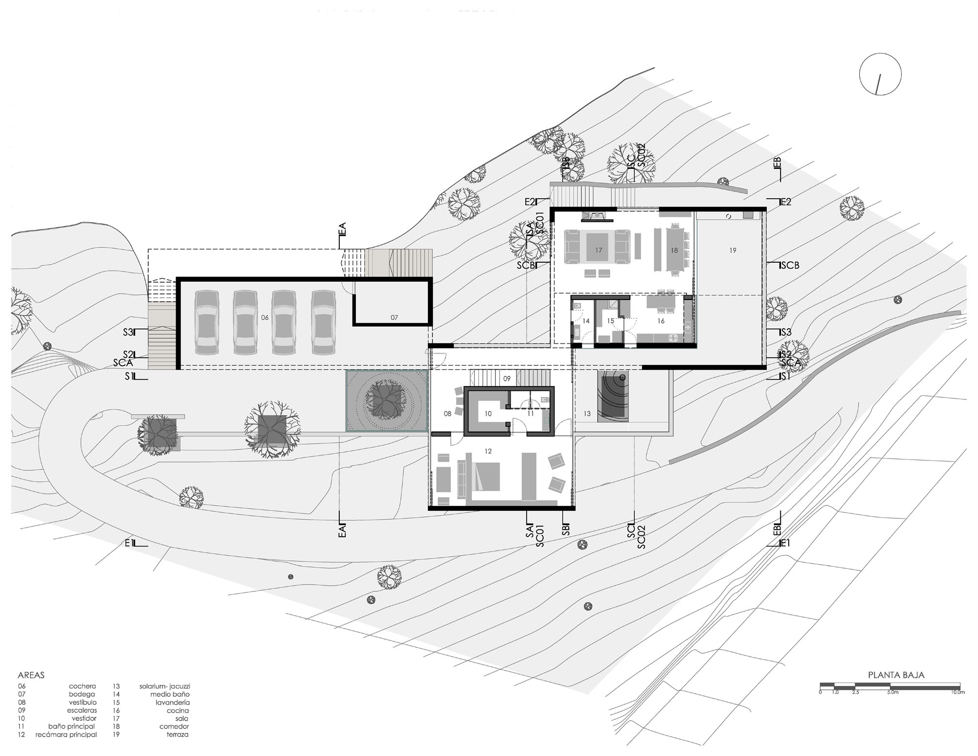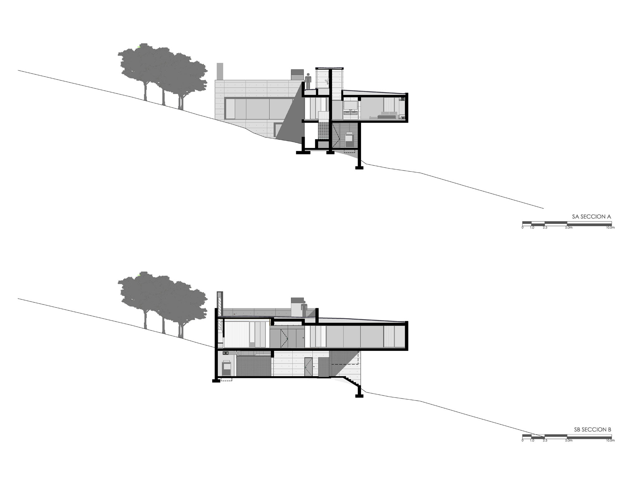 En un terreno de dificil pendiente con gran cantidad de árboles se proyecta una casa con un generoso programa desarollado en una planta principal de grandes dimensiones.