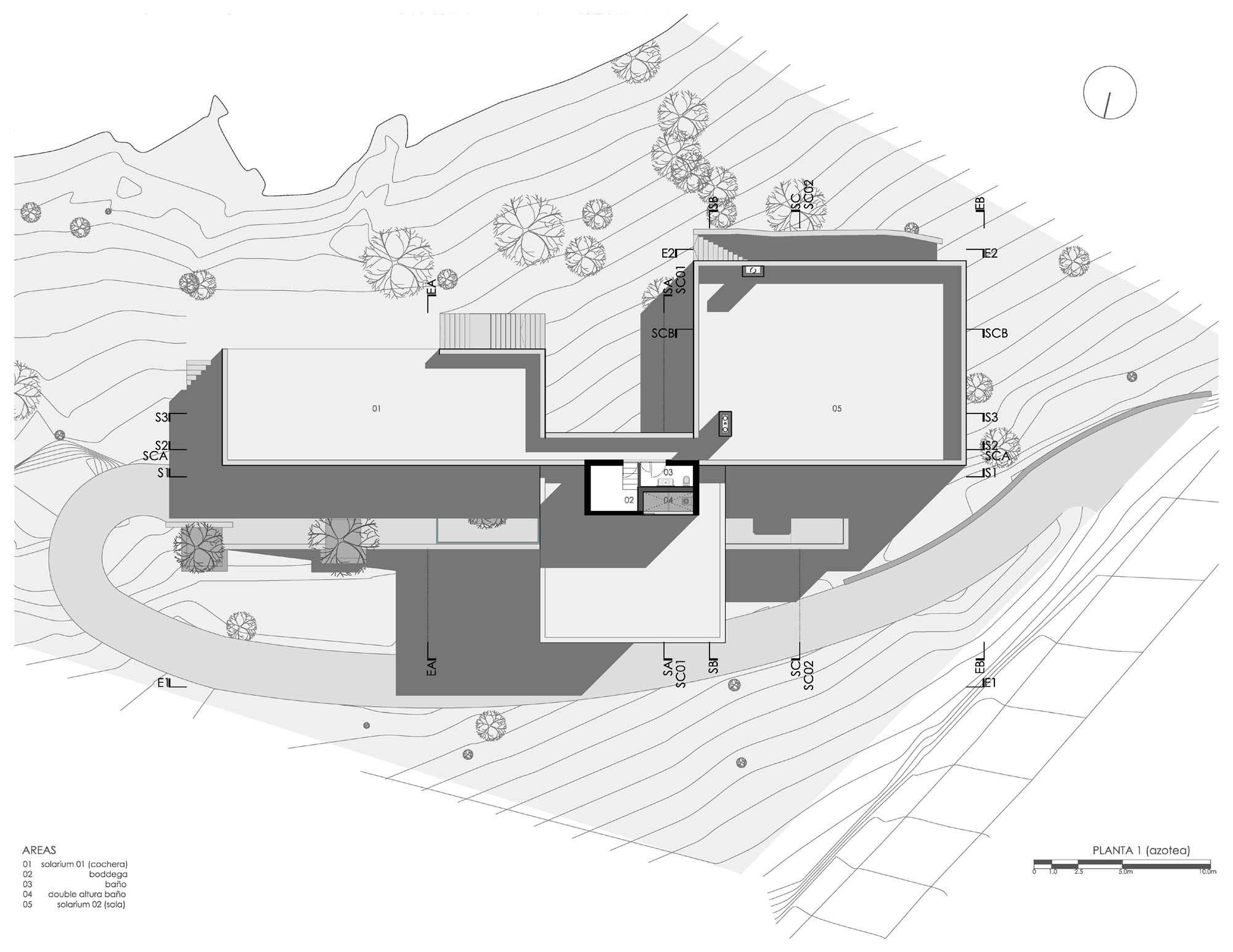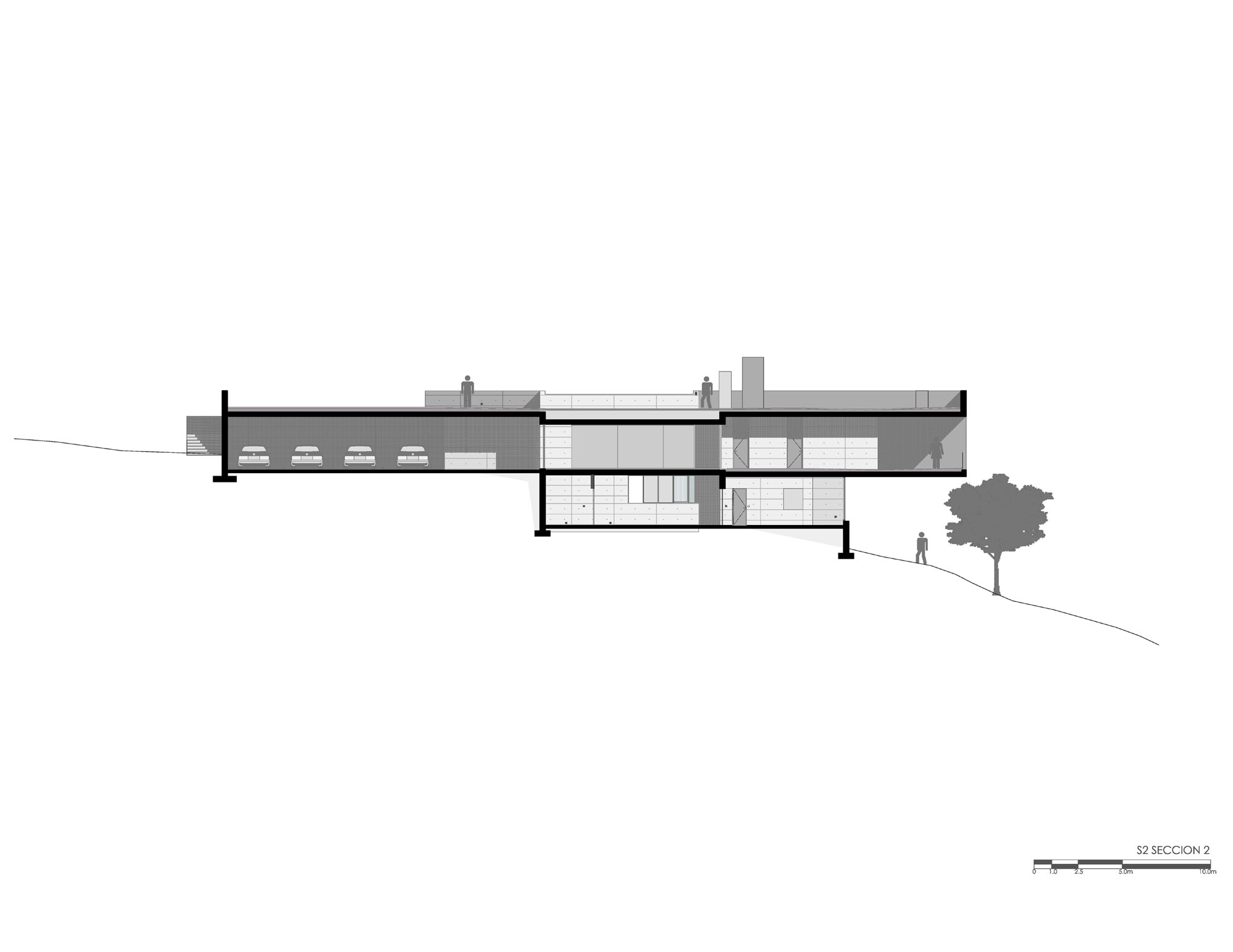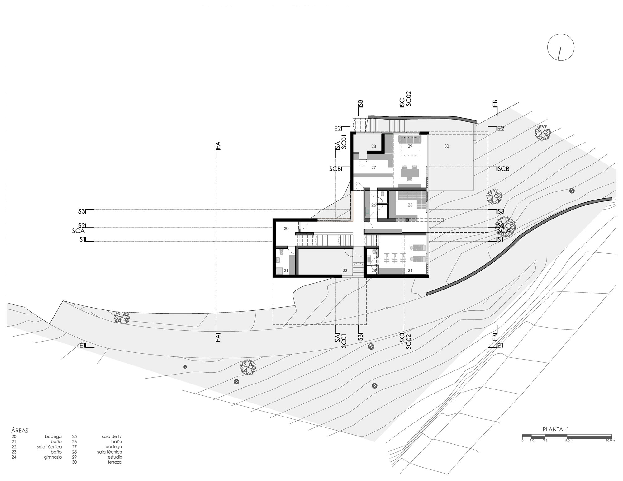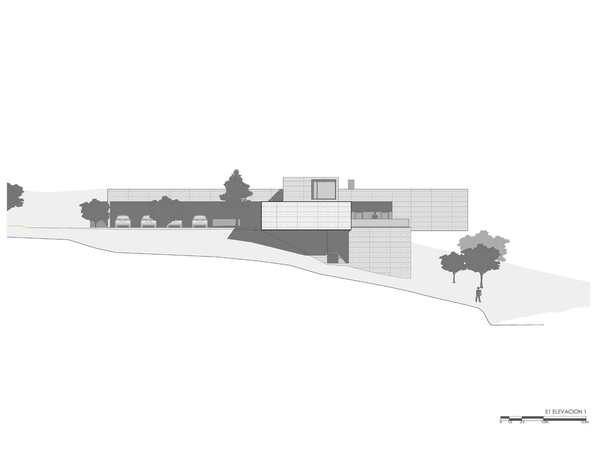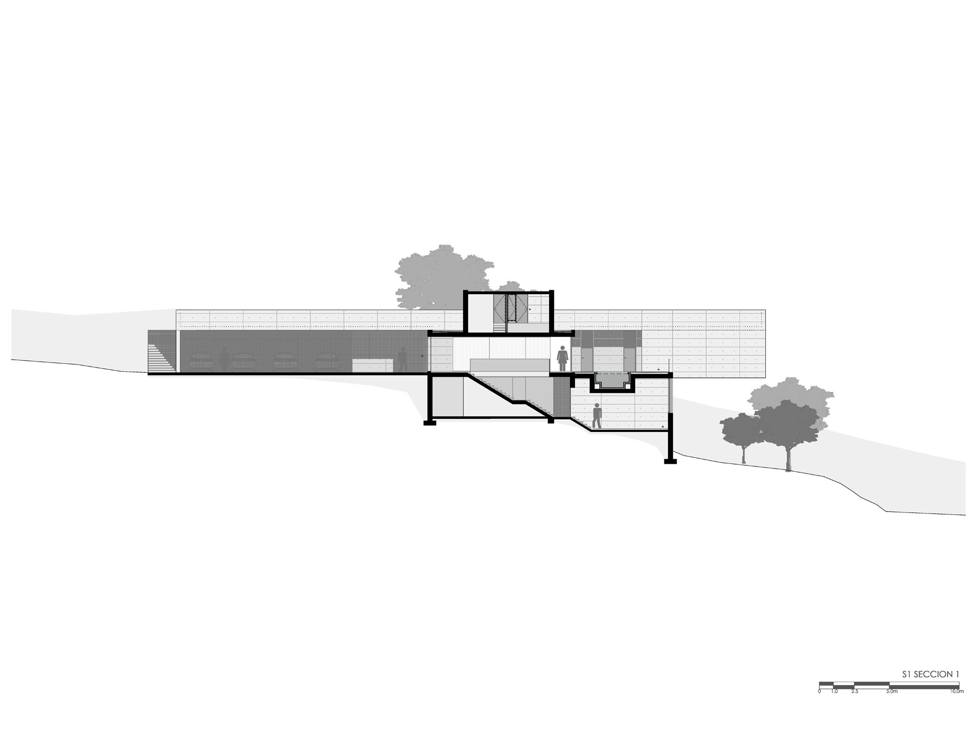 En un terreno de dificil pendiente con gran cantidad de árboles se proyecta una casa con un generoso programa desarollado en una planta principal de grandes dimensiones.