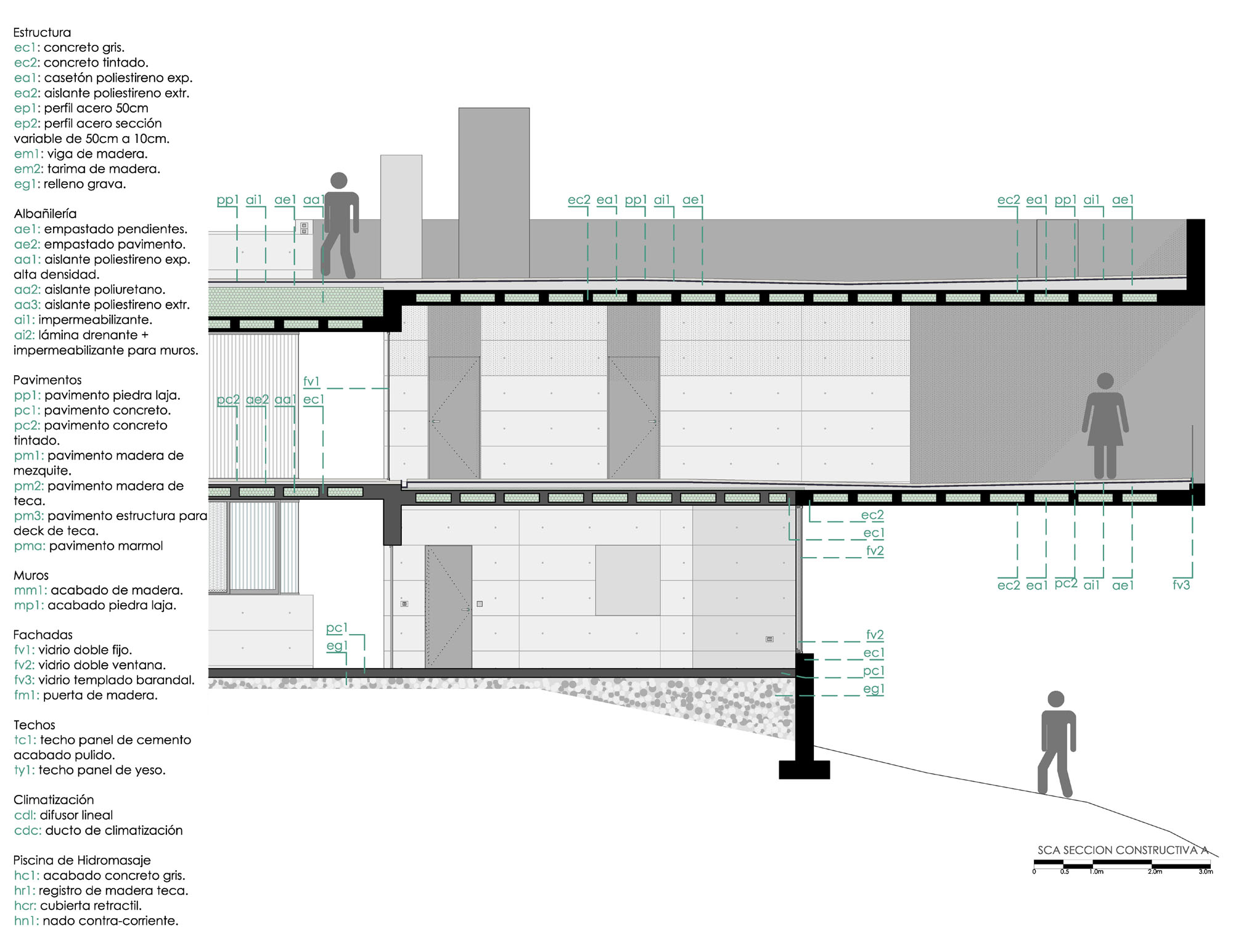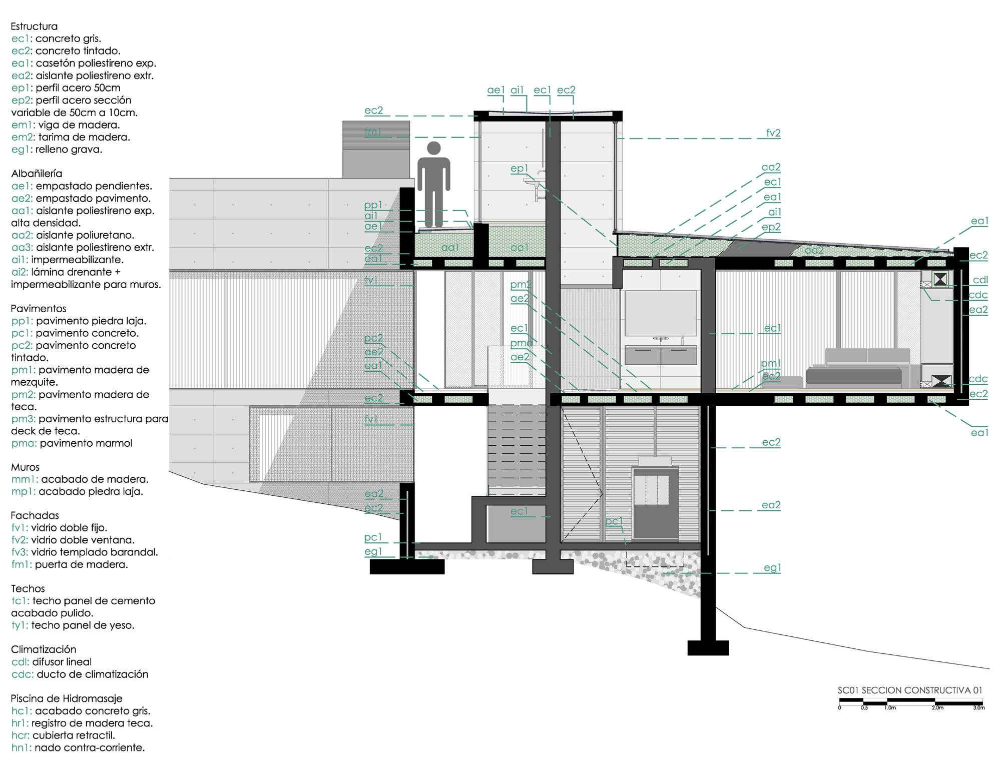 Por medio de enormes muros y vigas de concreto se consigue que la casa flote sobre la topografía y se determina la materialidad del proyecto.