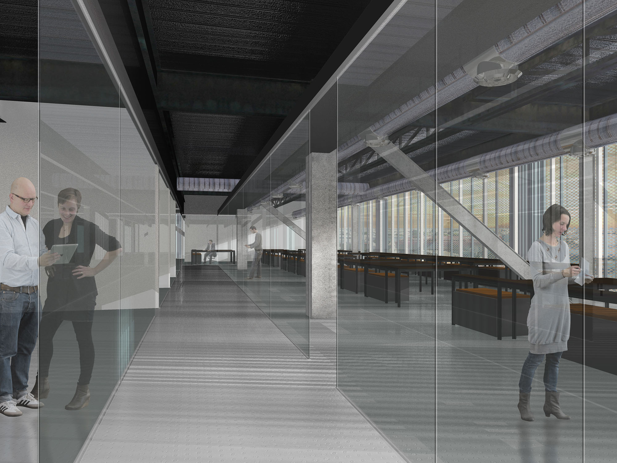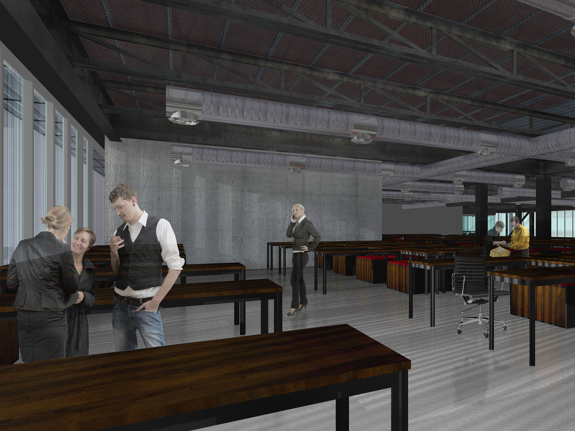La planta de oficinas, sin embargo, no reduce sus dimensiones. Ocupa completamente la esquina y queda suspendida sobre el acceso por un dramático cantiléver que genera una plaza techada. El edificio parte de un módulo estructural repetitivo en forma de retícula que simplifica su construcción y aprovecha los cambios de geometría como rampas o voladizos para dar un mayor carácter la volumetría.
