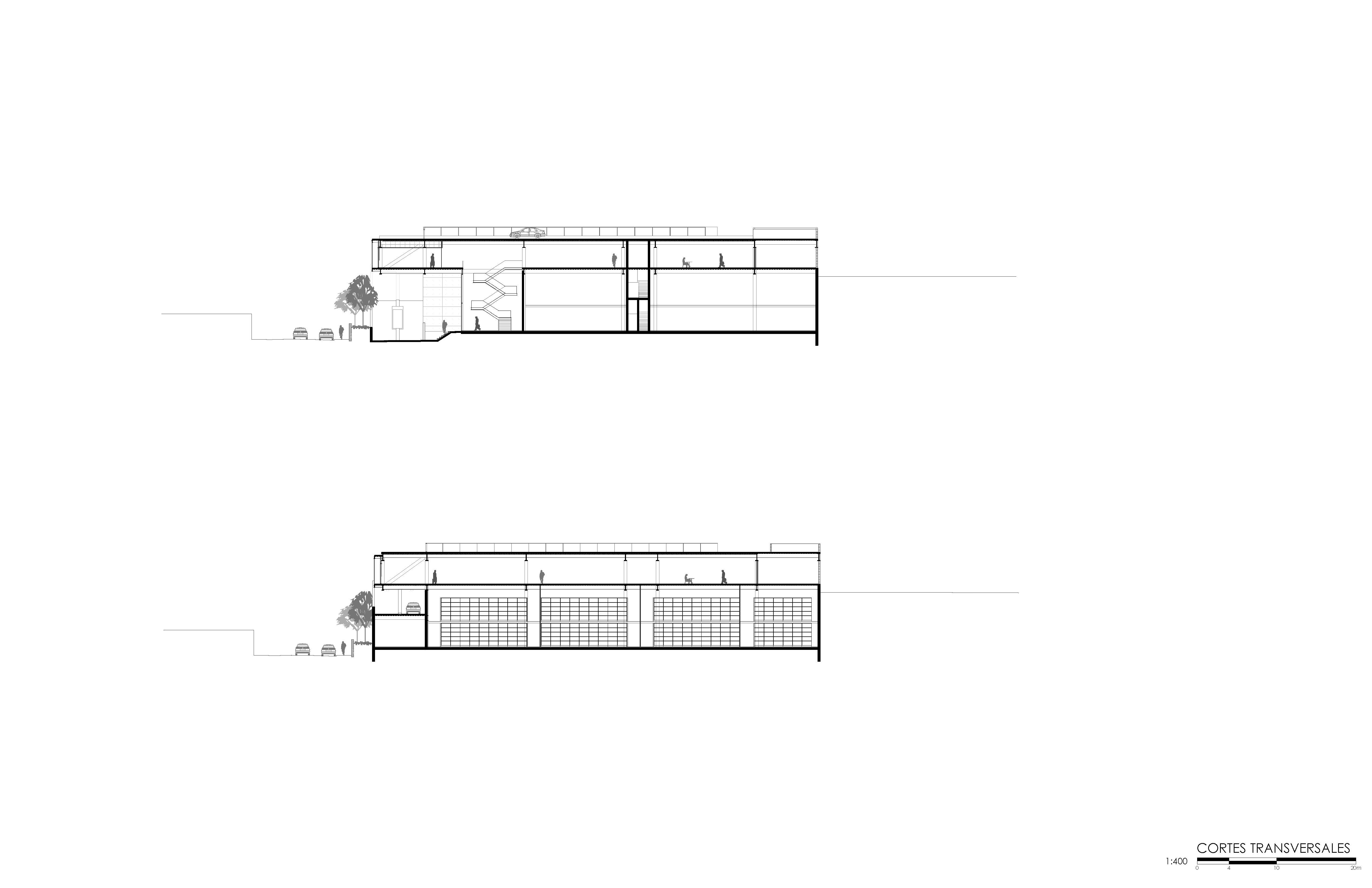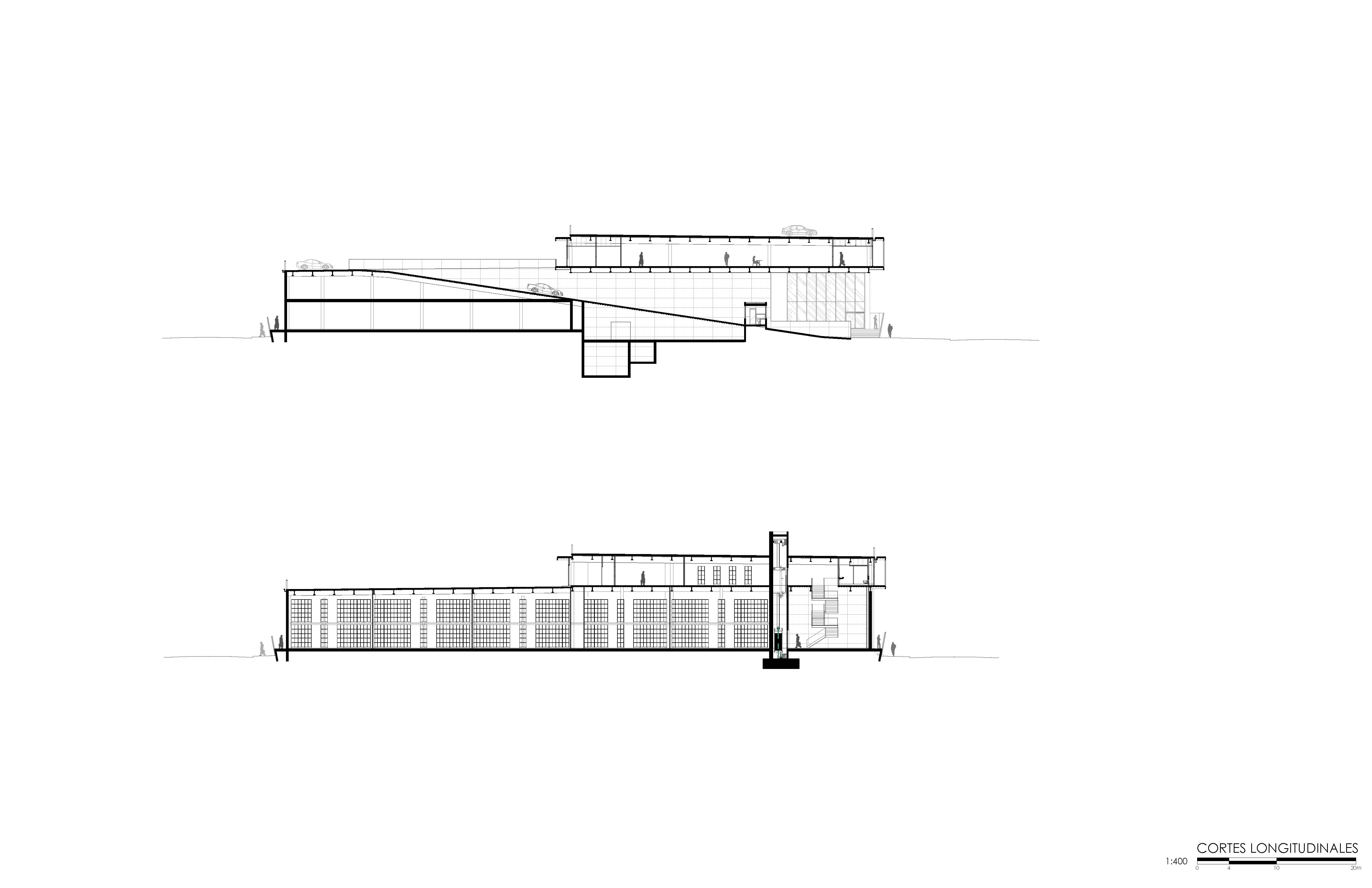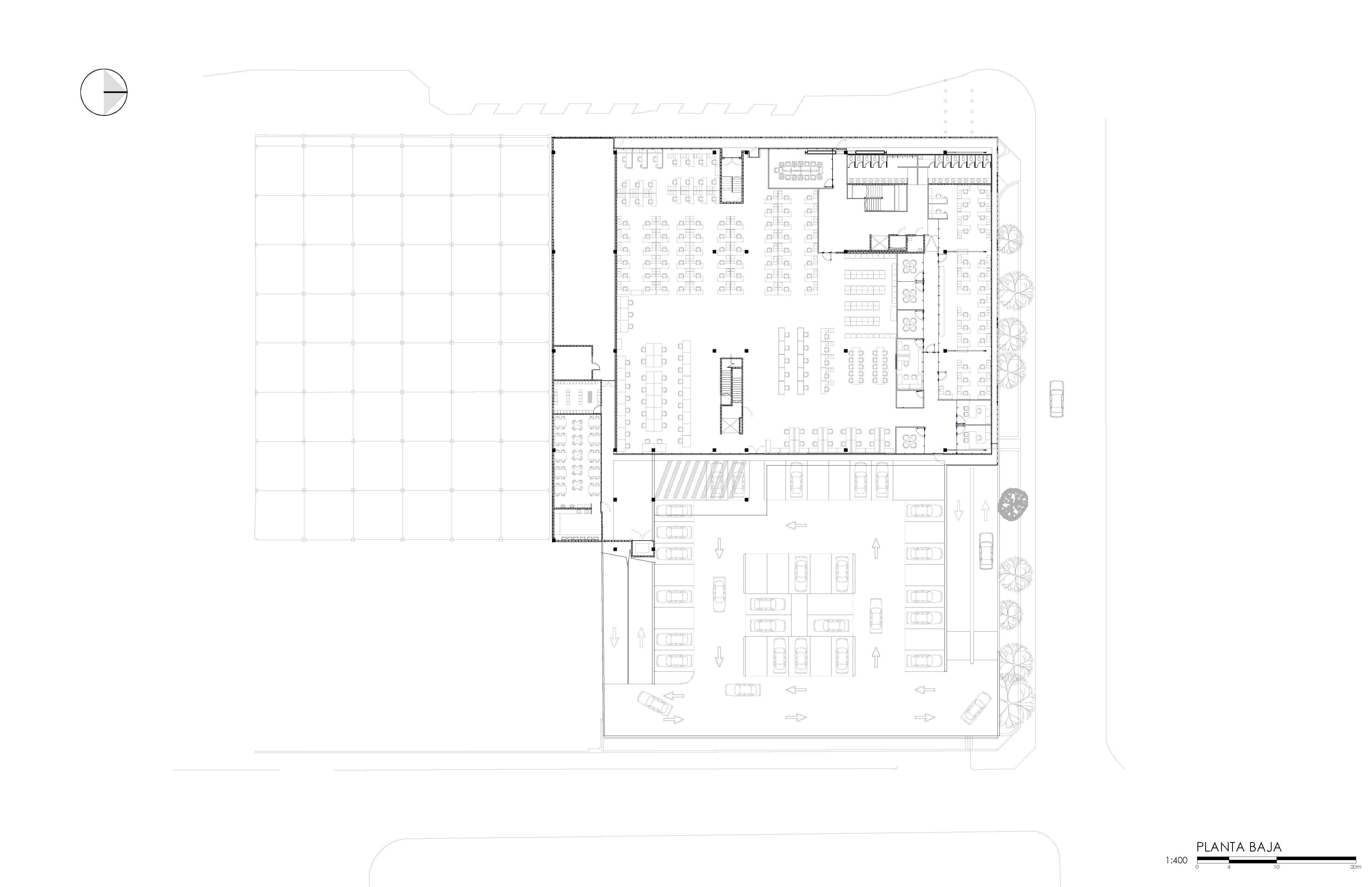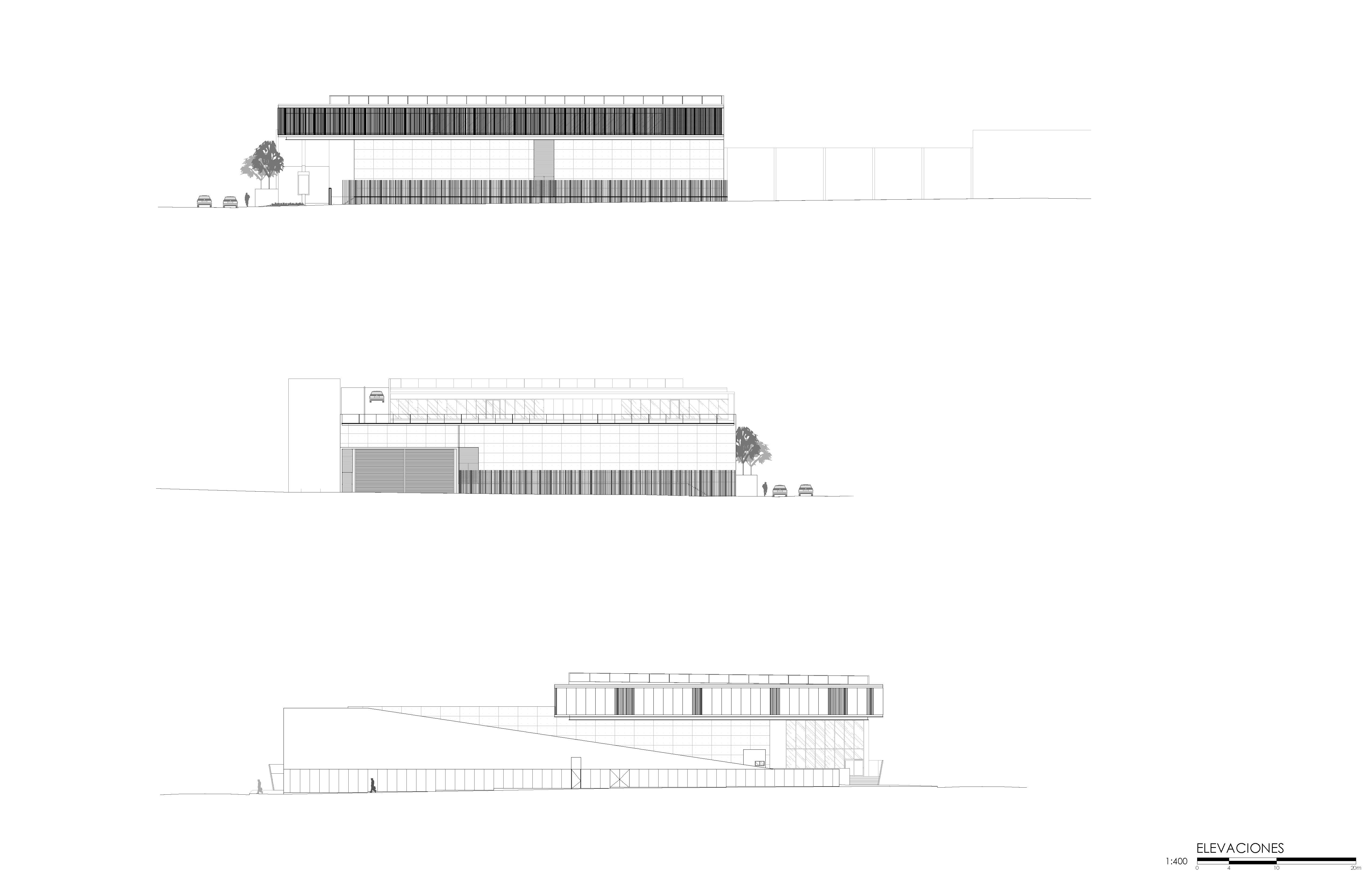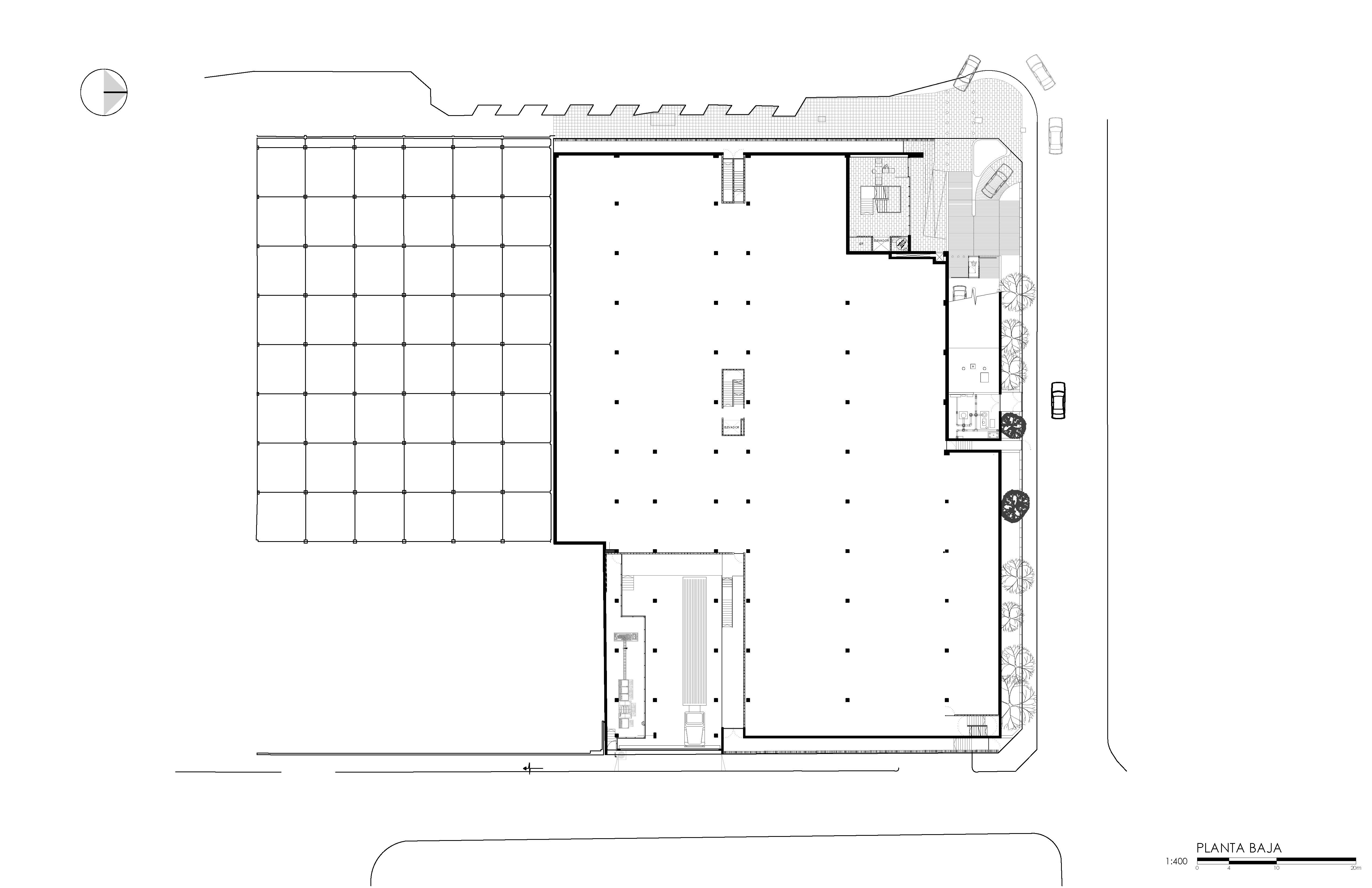 En las dos primeras plantas se proyecta un enorme almacén sobre el cual se ubican unas oficinas. La agresividad hacia el entorno que provocaría este gran volumen de construcción se minimiza al ubicar en la esquina de manzana la rampa que va hacia el estacionamiento de las oficinas.